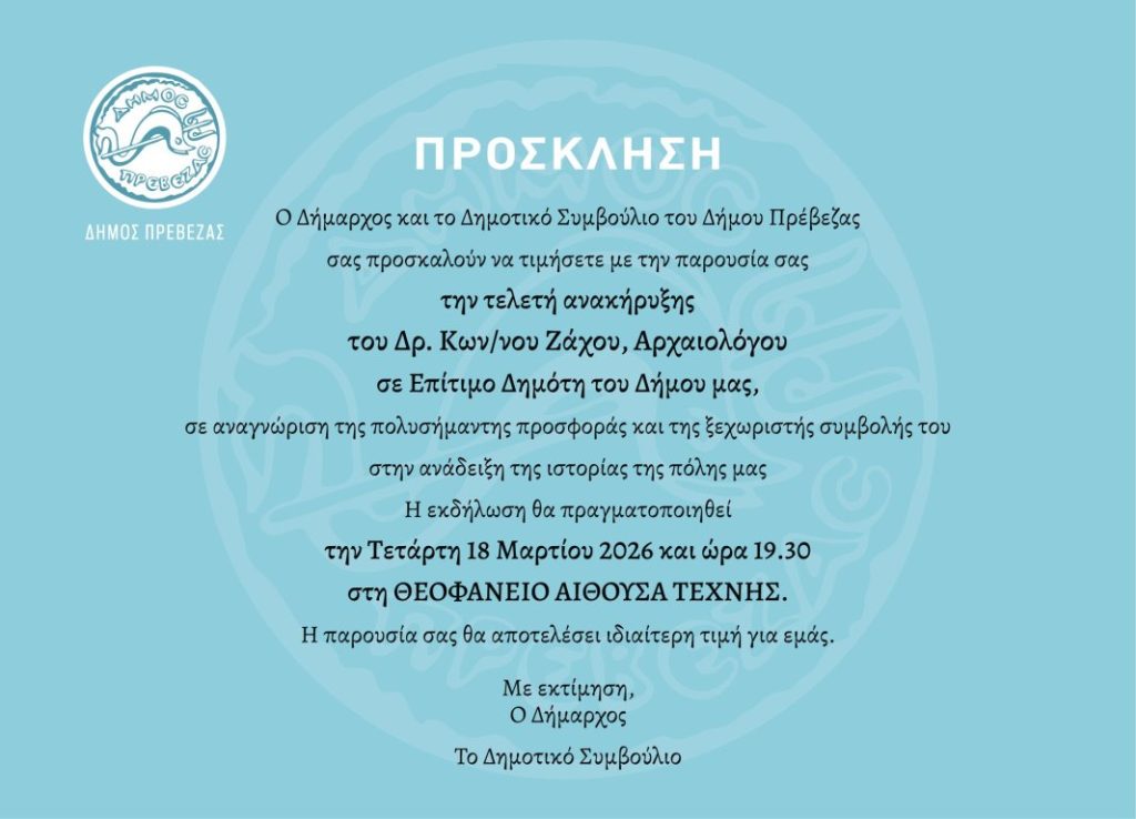 Στην ανακήρυξη του διακεκριμένου αρχαιολόγου Κωνσταντίνου Ζάχου σε επίτιμο δημότη θα προχωρήσει ο Δήμος Πρέβεζας την Τετάρτη 18 Μαρτίου ώρα 19.30 στην Θεοφάνειο Αίθουσα Τέχνης.