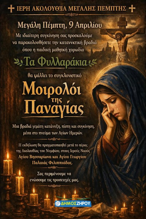 Τη Μεγάλη Πέμπτη, 9 Απριλίου, μετά το πέρας της Ακολουθίας του Νυμφίου, στους Ιερούς Ναούς Αγίου Βησσαρίωνα και Αγίου Γεωργίου, θα παρουσιαστεί το «Μοιρολόι της Παναγίας» από την παιδική μαθητική χορωδία «Τα Φυλλαράκια».