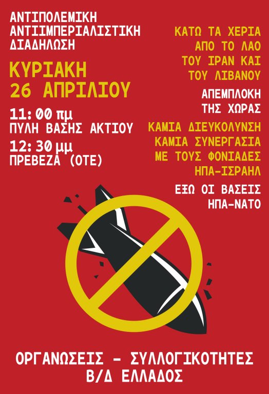 ΟΛΟΙ ΣΤΗΝ ΑΝΤΙΠΟΛΕΜΙΚΗ-ΑΝΤΙΙΜΠΕΡΙΑΛΙΣΤΙΚΗ ΣΥΓΚΕΝΤΡΩΣΗ ΣΤΗ ΠΥΛΗ ΤΗΣ ΒΑΣΗΣ ΤΟΥ ΑΚΤΙΟΥ ΣΤΙΣ 26/4 ΚΥΡΙΑΚΗ ΣΤΙΣ 11 π.μ. ΠΟΡΕΙΑ ΣΤΗ ΠΡΕΒΕΖΑ (12:30 μ.μ. ΟΤΕ)