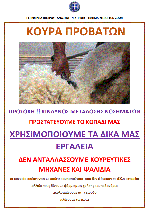 Από τη Διεύθυνση Κτηνιατρικής/Τμήμα Υγείας Zώων της Περιφέρειας Ηπείρου ενόψει της περιόδου κουράς των αιγοπροβάτων, και με στόχο την αποτροπή της διασποράς νοσημάτων και την προστασία της υγείας του ζωικού κεφαλαίου, ορίζεται η διαδικασία που πρέπει να ακολουθηθεί από όλους τους εμπλεκόμενους, υπό την εποπτεία της υπηρεσίας μας. Συγκεκριμένα πρέπει να τηρηθούν τα κάτωθι: