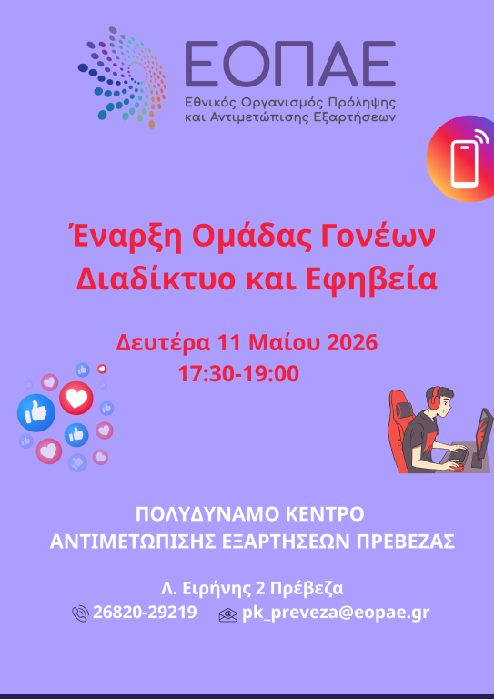Τη Δευτέρα 11 Μαΐου 2026 στις 17:30, το Πολυδύναμο Κέντρο Αντιμετώπισης Εξαρτήσεων Πρέβεζας του ΕΟΠΑΕ ξεκινά έναν κύκλο τριών εβδομαδιαίων συναντήσεων ομαδικής συμβουλευτικής για γονείς, αναφορικά με τη διαχείριση της προβληματικής χρήσης του διαδικτύου από τους εφήβους.