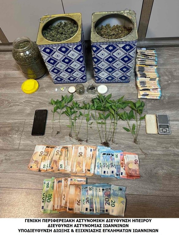 Κατασχέθηκαν – μεταξύ άλλων – 22 φυτά κάνναβης, πάνω από 1,5 κιλό ακατέργαστης κάνναβης και -8.720- ευρώ
