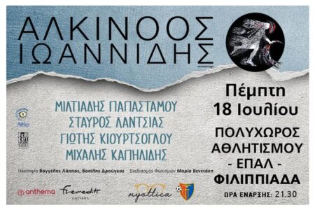 «1η Συναυλία Πόλης ΑΟΦ» Ο Αλκίνοος Ιωαννίδης στη Φιλιππιάδα 18.07.2024, 21:30 Προαύλιος χώρος Νέου Αθλητικού Πολυχώρου ΕΠΑΛ Φιλιππιάδας Ο Αλκίνοος Ιωαννίδης, ένας από τους […]