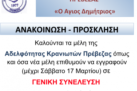 Το Δ.Σ. της Αδελφότητας Κρανιωτών Πρέβεζας «Ο Άγιος Δημήτριος» προσκαλεί τα μέλη του σε Τακτική Γενική Συνέλευση την Κυριακή 18 Μαρτίου 2018 […]