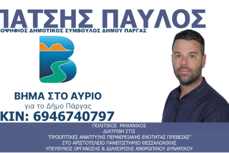 Διαβάστε περισσότεραΔήμος Πάργας “Βήμα στο Αύριο”-Χρυσόστομος Κύργιος: Με τη στήριξή σου, αποφασιστικό ΒΗΜΑ μπροστά!