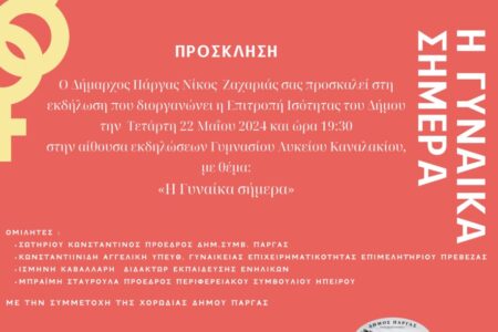 Ο ρόλος της γυναίκας είναι καθοριστικός. Ο Δήμος Πάργας αναλαμβάνει την πρωτοβουλία μέσω της Επιτροπής Ισότητας των δύο φύλων την πραγματοποίηση συνάντησης την Τετάρτη 22/5/2024 και […]