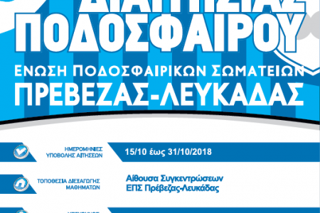 Η Επιτροπή Διαιτησίας της Ε.Π.Σ. ΠΡΕΒΕΖΑΣ-ΛΕΥΚΑΔΑΣ ανακοινώνει ότι από 05 ΝΟΕΜΒΡΙΟΥ 2018, θα λειτουργήσει Εισαγωγική Σχολή Διαιτησίας. Καλούνται οι ενδιαφερόμενοι να δηλώσουν συμμετοχή, […]