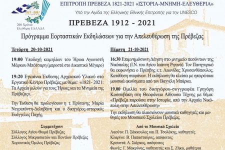 ΕΠΙΤΡΟΠΗ ΠΡΕΒΕΖΑ 1821-20121 «ΙΣΤΟΡΙΑ- ΜΝΗΜΗ- ΕΛΕΥΘΕΡΙΑ» Υπό την Αιγίδα της Ελληνικής Εθνικής Επιτροπής για την UNESCO ΠΡΕΒΕΖΑ 1912- 2021 Πρόγραμμα Εορταστικών Εκδηλώσεων για την Απελευθέρωση […]