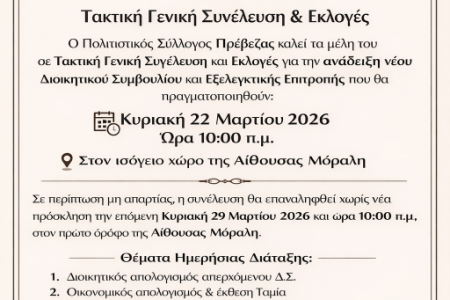 Ο Πολιτιστικός Σύλλογος Πρέβεζας θα πραγματοποιήσει Τακτική Γενική Συνέλευση και Εκλογές για την ανάδειξη νέου Διοικητικού Συμβουλίου και Εξελεγκτικής Επιτροπής την Κυριακή 22 Μαρτίου 2026 […]