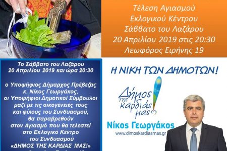 Το Σάββατο του Λαζάρου 20 Απριλίου 2019 και ώρα 20.30 στη Λεωφόρο Ειρήνης 19 στην Πρέβεζα, πραγματοποιεί αγιασμό ο συνδυασμός του δήμου Πρέβεζας […]