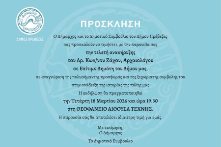 Στην ανακήρυξη του διακεκριμένου αρχαιολόγου Κωνσταντίνου Ζάχου σε επίτιμο δημότη θα προχωρήσει ο Δήμος Πρέβεζας την Τετάρτη 18 Μαρτίου ώρα 19.30 στην Θεοφάνειο Αίθουσα Τέχνης. […]